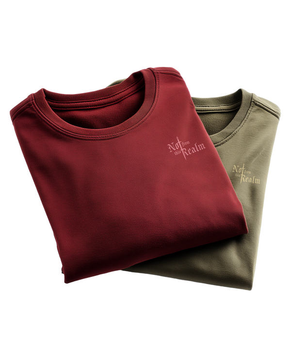 Some images are AI rendered to capture the Not From This Realm aesthetic. Product photos show the actual garment.