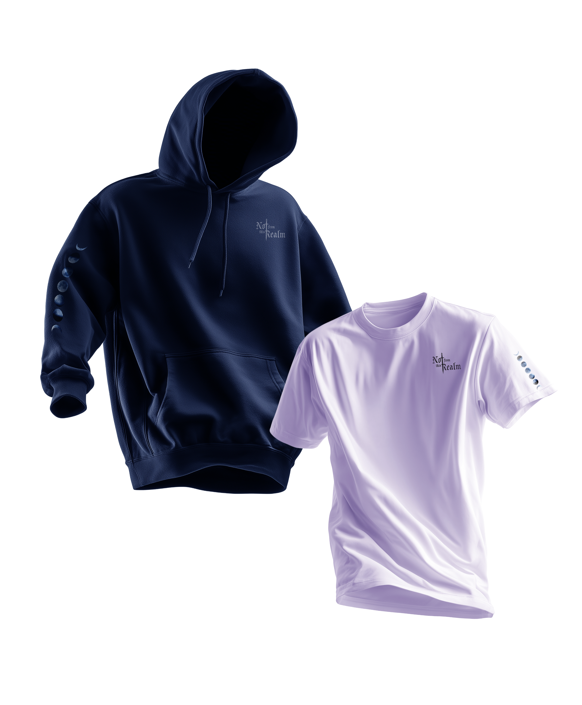 Some images are AI rendered to capture the Not From This Realm aesthetic. Product photos show the actual garment.
